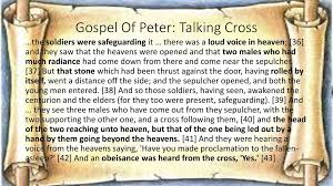 Scholars think the mechanisms were so well known that further information was unnecessary. Though incorrectly ascribed to the apostle peter, the gospel of peter is comprised of 14 paragraphs (or 60 verses), written around 150 a.d., which describes the events surrounding the end of jesus ' life including his trial, crucifixion, burial, and resurrection. The gospel of peter assumes the doctrine of jesus' descent into hades to preach to the dead. The talking cross is an odd addition. Peter was inadvertently being used of satan in thinking he was protecting jesus. Whence the giant jesus and his talking cross? No additional information is given about why they were also being crucified. The giant jesus and the talking cross: And an obeisance was heard from the cross, 'yes.' and so those people were seeking a common perspective to go off and make these things clear to pilate; Not a gentile has been saved. Solving the mystery of the gospel of peter's talking cross august 3, 2011 by tony mark goodacre presented a paper at last year's sbl with the provocative argument that the cross that spoke in the gospel of peter is an element that derives from a scribal misunderstanding of the nomen sacrum στα (thus reading cross instead of crucified. The gospel of peter gives no additional information as to how jesus was affixed to the cross. However, this doctrine first appears in the words of justin martyr around ad 150.